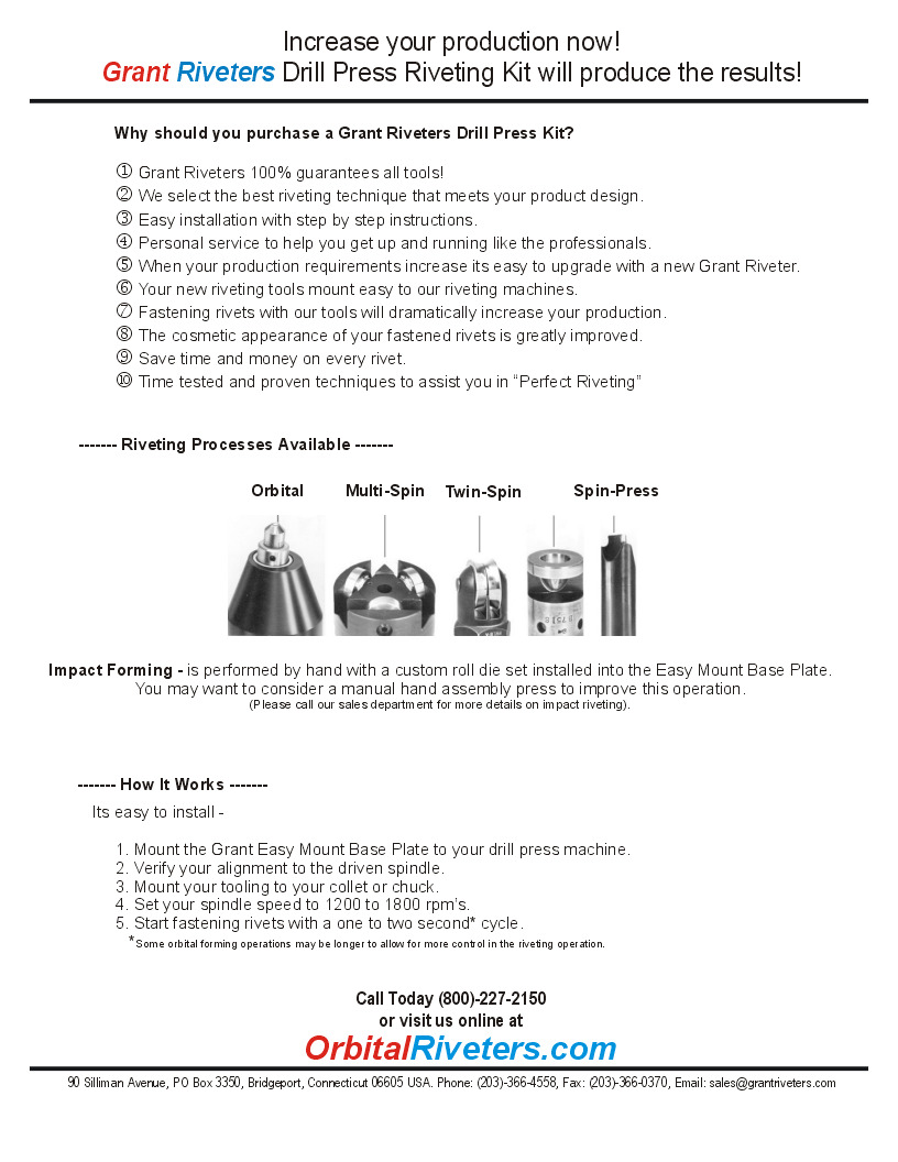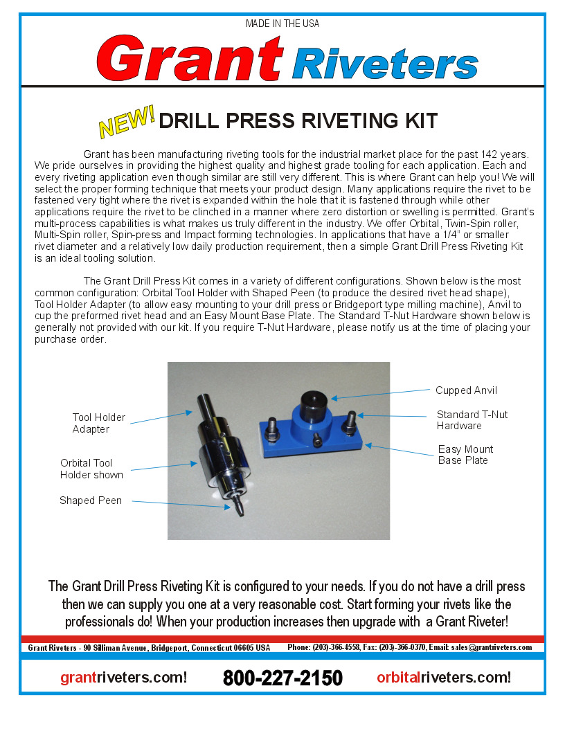 priced separately and sold for US$ 150.00 each. A Grant Drill Press Riveting Kit is a great, low cost way to